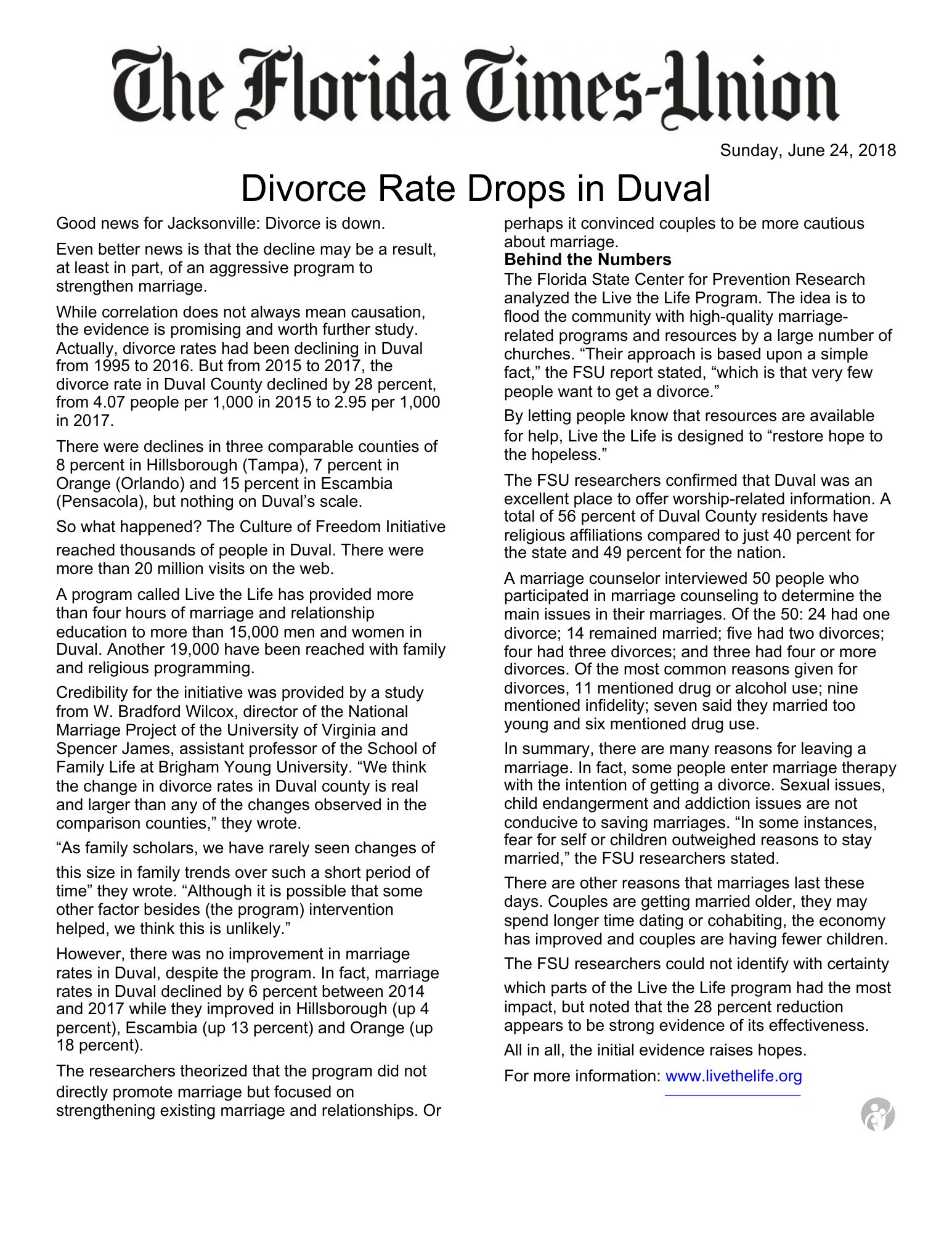 Our proudest accomplishment here locally was what we’ve called the Jacksonville miracle. Jacksonville used to be considered the divorce capital of Florida, but thanks to a collaborative effort between Live the Life and several local churches, between 2015 and 2017, the divorce rate in Duval County dropped by 28%! We did this by offering marriage enrichment programs, as well as weekend marriage intensives, to couples in and around Jacksonville. During these three years, the number of divorces was at least 700 fewer than in previous years. At an average cost to the city of $30,000 per divorce, that would be a savings of $21 million each year. Since then, this event has been studied by several relationship professionals and has even been mentioned in three different books!