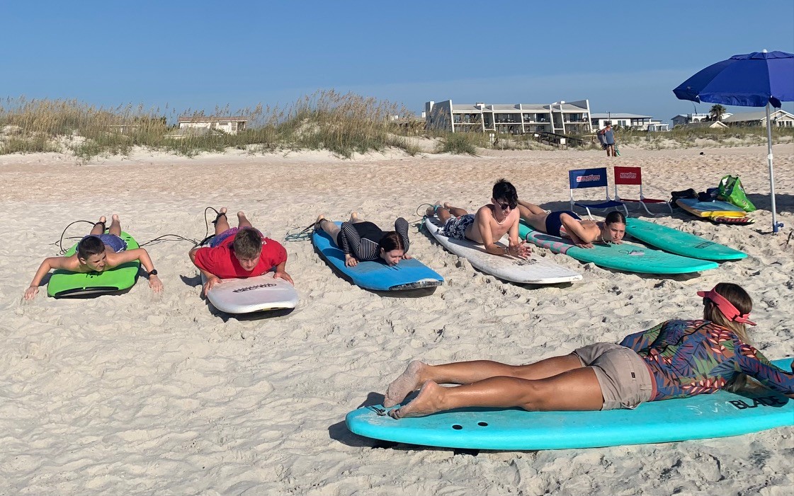 I specialize in surf lessons/surf coaching. So while I’ve been practicing surfing for over 30 yrs, only teaching for 8 yrs or so. I realized my passion for sharing/teaching surfing after working for my friends at three surf camps here in St Augustine, FL, and still manage to get overflow lessons from surf shops in the area for people looking for guidance in ST Augustine, etc. I have collected the boards slowly and have a nice collection for teaching. Lately, I’ve been getting into teaching year-round, which requires wet suites in the colder water, of course, during our winters which is incredible with the right equipment. It’s such an honor to share surfing and be available to meet and guide anyone wanting to develop their relationship with the ocean, especially in St Augustine. I’ve had even the blessings of working with all kinds of people, even those with special needs or challenges, so I have come to recognize the deep value or cathartic healing that surfing and the water can spark for anyone. Surfing is for everyone and can provide legit stoked and healthy high for anyone willing to engage. There are so many programs trying to make surfing accessible to everyone. I’ve been so happy to participate in different organized surf days aimed at people with special needs requiring assistance to surf, get stoked, and provide healing for all involved. I have been thinking of different ideas to get together in small groups of ladies to bond and have fun as we practice our path of the surf journey! I’ve always loved how the moon rises on the beach around the full moon at sunset and have for over 10 years tried to organize spectacular surf times to gather and even do things like play drums or something to bond and grow in support together. I hope to specialize in making surfing accessible for anyone, especially females or anyone needing the healing energy or the cathartic experience of interacting with the ocean.