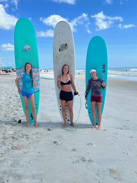 Growing up on Jacksonville beach, I always loved the water and enjoyed the power and energy of the ocean waves with my family. I had lived in houses right on Jax beach. My aunts and uncles managed to have a place together on Jacksonville beach, and we had many family reunions on vacations at the beaches and at rental homes in Vilano. I was on the swim and diving teams in high school and the dance-type flag/rifle teams in middle school. I never knew I might go on to combine my skills of dance movement finally with the sport of surfing to teach others to groove/flow/dance on their surfboards on the magical ocean toys of waves. Surfing was always something that deeply intrigued me as I carried a surf magazine around my first years in high school and everywhere. I also was gifted a surfboard (shaped by Sandy Forsyth of Aqua East) from my folks at 12 to support my interest. I wasn’t very good with it and did not get the opportunity to learn to surf it as much as I wanted, and I did more wake surfing on the river in Mandarin in high school. We didn’t have foam tops yet at all then, and my friends didn’t know to push me into the waves, I guess, so I paddled around and pearled a lot, mostly while watching others take my board to catch a wave just proving my board would work, but I never felt I had learned myself the way I needed.