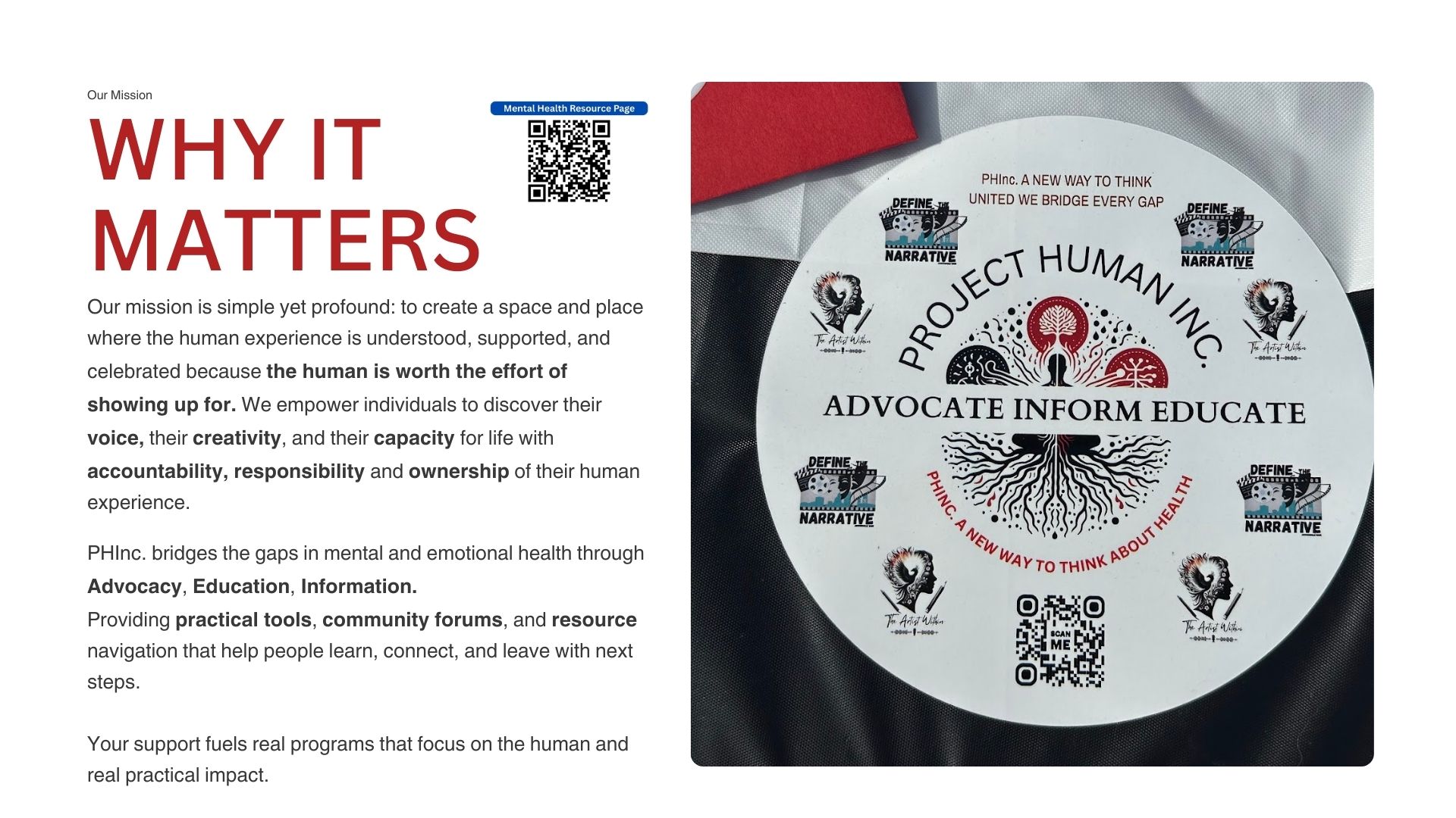PHInc. is different because we’re peer-to-peer and human-first. We don’t lead with labels—we lead with humanity. Our work lives where creativity meets care: The Artist Within Podcast, our Monthly Community Conversations, and our multi-year documentary Define the Narrative, filmed with the Jacksonville community. In 2026 we’re bringing it all together with Runway to Resilience (May 9th)—a fashion-and-arts night that honors mothers and families, veterans and first responders, teachers and healthcare workers, and every human carrying something heavy. This event helps us finish the documentary with the resilient ending our city deserves.